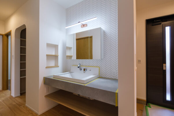 洗面スペースはあえて玄関横に設置。